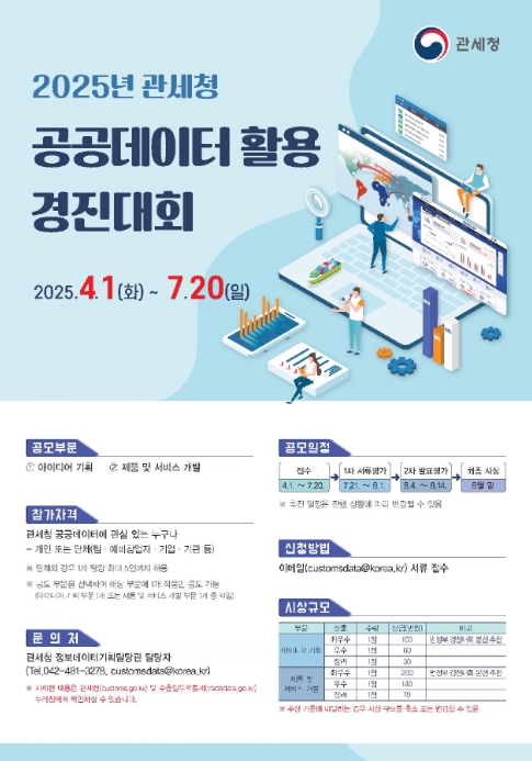 관세청은 공공데이터로 개방된 관세무역데이터를 활용한 혁신적인 창업아이디어를 발굴·지원하기 위해 4월 1일부터 '2025년 관세청 공공데이터 활용 경진대회'를 개최한다.