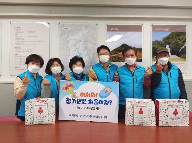 청기면지역사회보장협의체 위원들은 올해 청기면에서 태어난 3명(2020.12.11.출생신고 기준)의 아기들을 위해 유아내의 및 의류, 산모를 위한 영양제 등 15만원 상당의 육아용품과 복지서비스 안내 책자를 방역수칙 준수 하에 비대면으로 안전하게 전달했다.