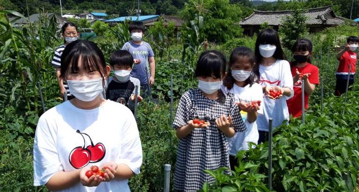 ▲ 지난 7월 군위 의흥초등학교에서 생명존중, 협동 등의 인성 가치 함양을 위해 텃밭가꾸기를 하고 수확하는 모습