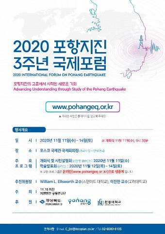 포항시는 포항지진 발생 3주년을 맞아 11월 11일부터 14일까지 11.15지진 지열발전 공동연구단(단장 정상모) 주최로 「2020 포항지진 3주년 국제포럼」을 온.오프라인으로 병행하여 개최할 것이라고 밝혔다.
