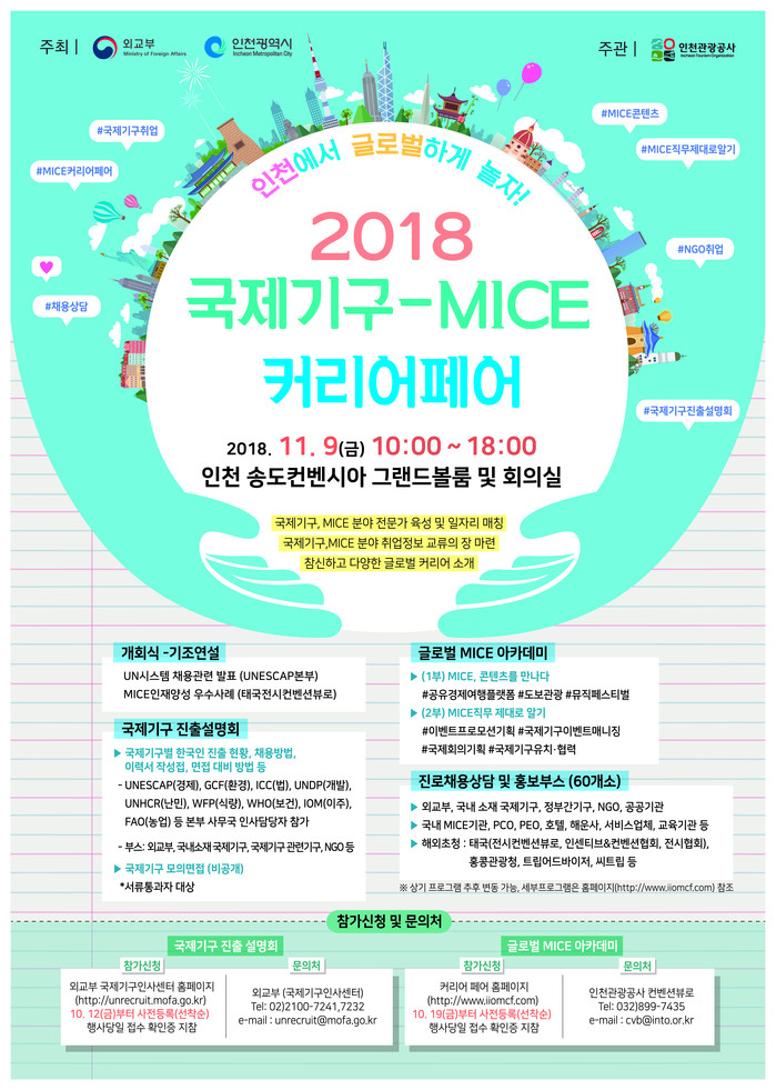 인천관광공사는 인천광역시와 외교부가 함께 '국제기구-MICE 커리어 페어'를 오는 9일 인천 송도컨벤시아에서 개최한다고 8일 밝혔다.