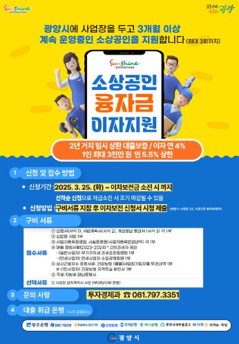 광양시는 경기 침체와 운영난을 겪고 있는 소상공인의 부담을 덜기 위해 오는 3월 25일부터 '2025년 광양시 소상공인 융자금 이차보전 지원사업'을 시행한다고 밝혔다.