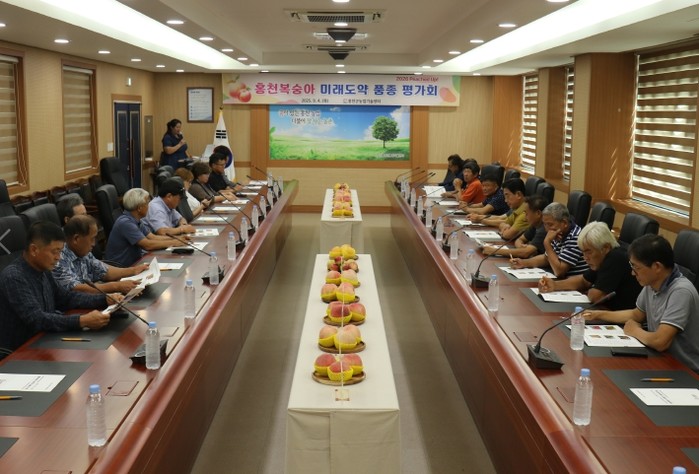 홍천군은 9월 4일 복숭아 선도농업인 등 30여 명과 함께 홍천 복숭아 산업 육성을 위한 다양성 확보를 위해 미래 도약 품평회를 추진했다.