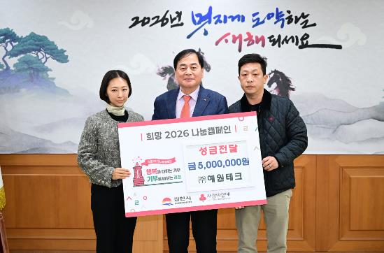 김천시는 지난 15일, ㈜예원테크(대표 정재욱)로부터 희망2026나눔캠페인 성금 500만 원을 전달받았다고 밝혔다.
