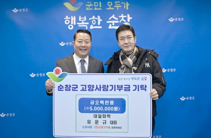 순창군은 9일 대일화학 유운규 대표가 고향사랑기부금 500만원을 기탁했다고 밝혔다.