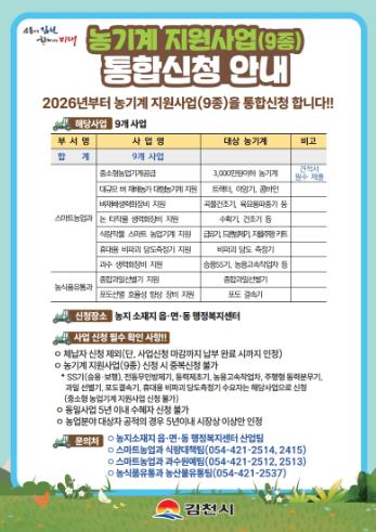김천시는 지역 농업인을 대상으로 ‘2026년 농기계 지원사업(9종)’ 신청을 오는 2026년 1월 30일(금)까지 농지소재지 읍면동 행정복지센터에서 접수한다고 밝혔다.