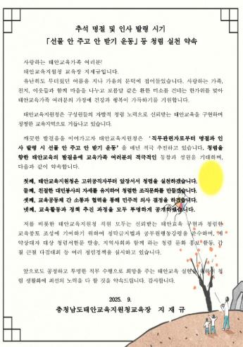 충청남도태안교육지원청은 추석 연휴 시기를 맞아 청렴한 공직문화를 확산하기 위해 ‘선물 안 주고 안 받기 운동’을 강조하는 청렴 서한문을 홈페이지에 게시했다.