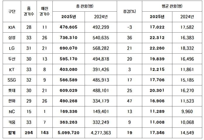 ▲ 2025년 구단별 관중 현황(2024-2025 홈 경기수 비교) |