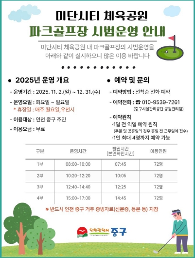 인천시 중구는 미단시티 체육공원 내에 ‘파크골프장’을 새로 조성하고, 오는 11월 2일부터 시범운영에 들어간다고 밝혔다.