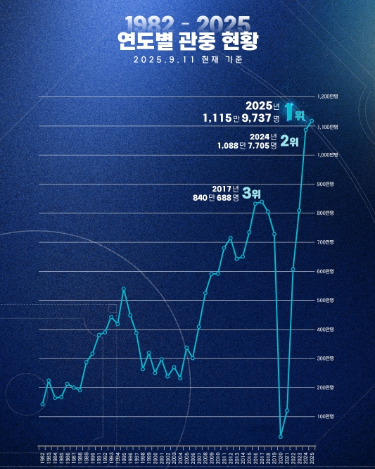 ▲ 연도별 관중 현황(1982~2025) |