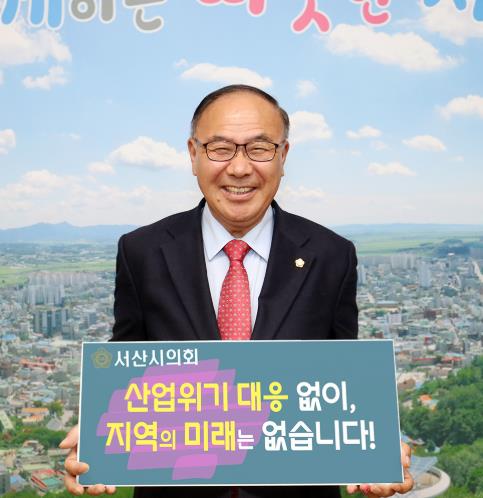 서산시의회 조동식 의장이 지난 30일, 사회관계망서비스(SNS)에 ‘산업위기 대응 없이, 지역의 미래는 없습니다’라는 메시지가 담긴 피켓을 들고 있는 인증사진을 게시하며, ‘산업위기 선제 대응지역 지정 촉구’ 챌린지에 동참했다.