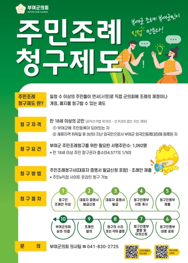 부여군의회는 주민들이 직접 조례의 제정·개정·폐지를 청구할 수 있는 ‘주민조례청구제도’에 대한 군민 인식을 높이고, 참여를 유도하기 위한 홍보 활동을 본격 추진하고 있다고 밝혔다.