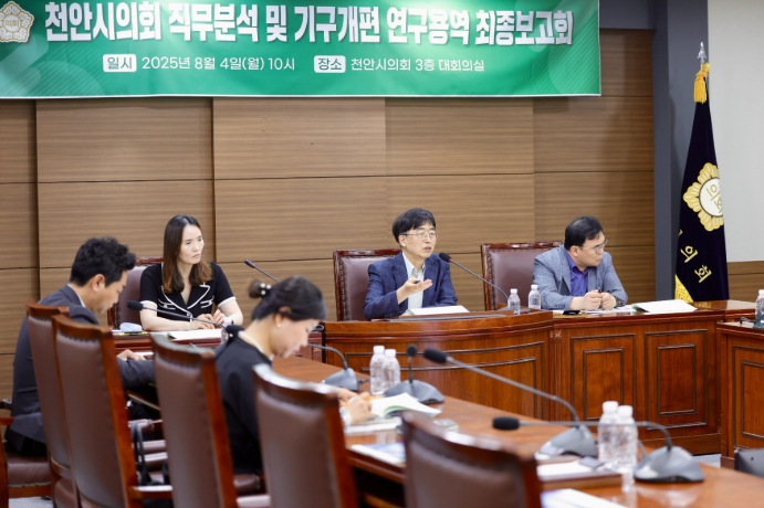 천안시의회는 지난 4일 오전 10시, 의회 대회의실에서 『천안시의회 직무분석 및 기구개편 연구용역 최종보고회』를 개최했다.