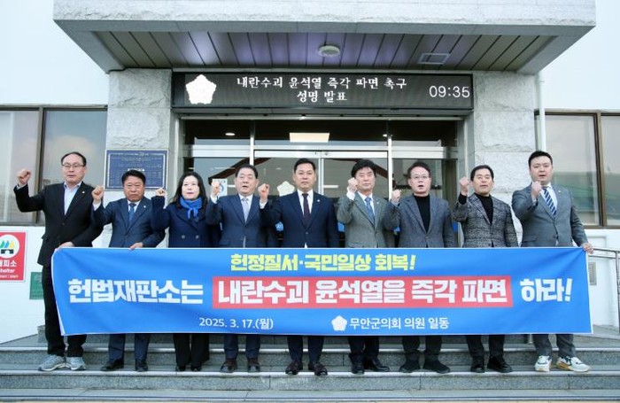 무안군의회가 17일 군의회 청사 앞에서 긴급 성명을 내고 윤석열 대통령을 즉각 파면할 것을 촉구했다.