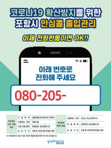 포항시는 주민들의 읍면동 청사 출입에 대한 편의 제공을 위해 10월 15일부터 시청, 읍면동을 기준으로 080(수신자 부담) ‘안심콜(Call) 출입관리서비스’를 실시한다.