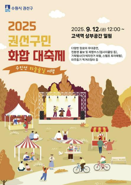 수원시 권선구는 오는 12일에 '2025 권선구민 화합 대축제' ‘수인선 하늘숲길 여행’ 축제를 고색역 상부공간 일원에서 개최한다.