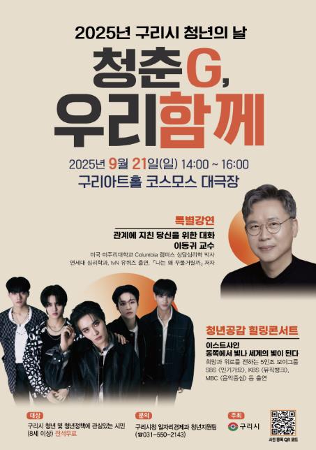 구리시는 오는 9월 21일 오후 2시 구리아트홀 코스모스 대극장에서 ‘2025 구리시 청년의 날- 청춘G, 우리 함께’ 행사를 개최한다.