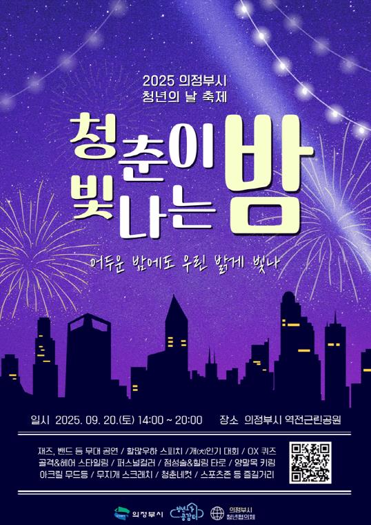 의정부시는 9월 20일 오후 2시부터 8시까지 의정부 역전근린공원에서 ‘2025년 청년의 날 축제(청춘이 빛나는 밤:청빛밤)’을 개최한다.
