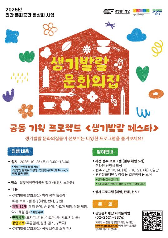 (재)광명문화재단은 2025년 민간 문화공간 활성화 사업 '생기발랄 문화의집' 공동 기획 프로젝트 ‘생기발랄 페스타’를 10월 25일 오후 1시에 달맞이어린이공원에서 개최한다.