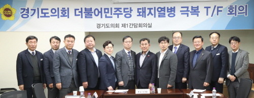 이날 회의에는 경기도의회 더불어민주당 돼지열병 극복 T/F 단장 백승기(안성2), 부단장 채신덕(김포2), 이종인(양평2), 김철환(김포3), 유광국(여주1), 조성환(파주1), 김경일(파주3) 의원 등이 참석하였다.