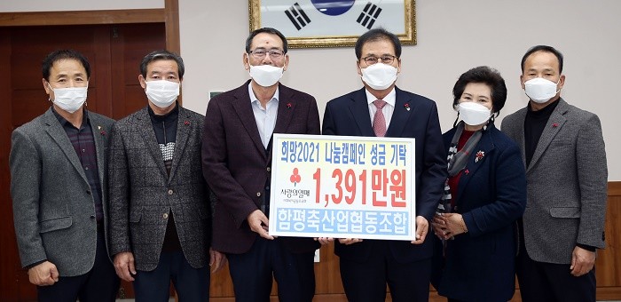 이날 함평축협(조합장 김영주)에서 1천391만 원, ㈜진산건설(대표 박진석)에서 3백만 원, (사)한국임업후계자협의회 함평군지회(지회장 김창열)에서 2백만 원을 각각 기부했다.