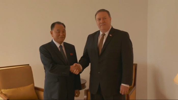 ▲ 김영철 북한 노동당 부위원장(왼쪽)과 마이크 폼페이오 미 국무장관(오른쪽)의 모습. <사진=인터넷 갈무리> |