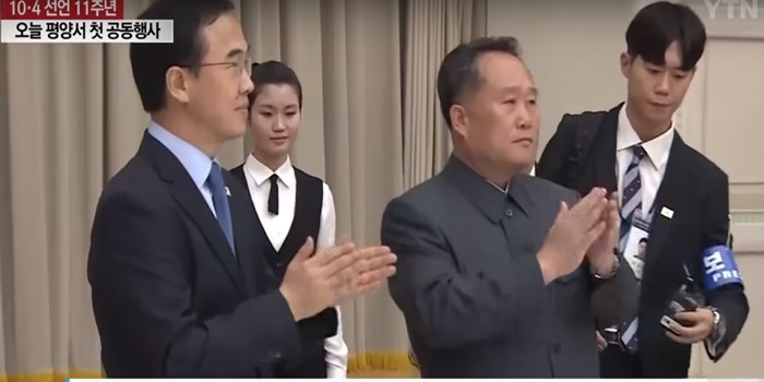 | ▲4일 평양 인민문화궁전에서 진행된 10·4선언 발표 11주년 기념 민족통일대회에 참석한 조명균 통일부 장관과 리선권 조국평화통일 위원장. <사진=YTN 뉴스 제공> |
