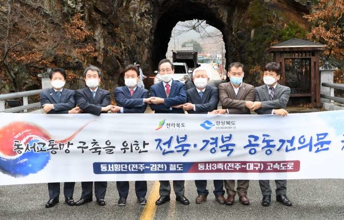경상북도와 전라북도는 19일 신라와 백제의 국경을 이루던 역사의 통로인 전북 무주군 라제통문에서 영남과 호남의 화합을 견인할 동서횡단철도(김천~전주간)와 동서3축(대구~전주간) 고속도로 건설을 위한 공동건의문을 채택했다.