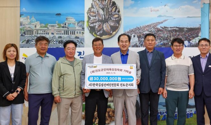 (재)진도군인재육성장학회는 13일, 사)한국김생산어민연합회 진도군지회로부터 총 3,000만 원의 장학금을 기탁받았다고 밝혔다.
