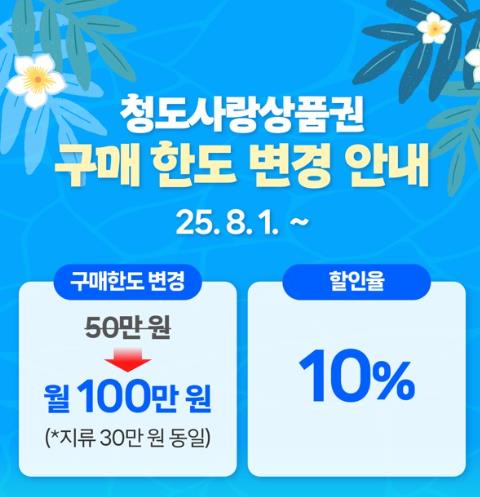 청도군은 군민들의 소비 여력을 높이고 지역경제 활성화를 위해 오는 8월 1일부터 청도사랑상품권의 월 구매한도를 기존 50만원에서 100만원으로 상향한다고 밝혔다.