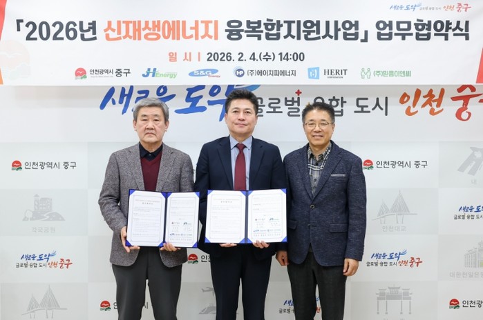 김정헌 인천 중구청장은 지난 4일 중구청 구청장실에서 컨소시엄 참여기업 5곳(㈜제이에이치에너지, ㈜에스앤지에너지, ㈜에이치피에너지, ㈜헤리트, ㈜믿음이앤씨)과 ‘2026년도 신재생에너지 융복합지원사업 업무 협약’을 체결했다.