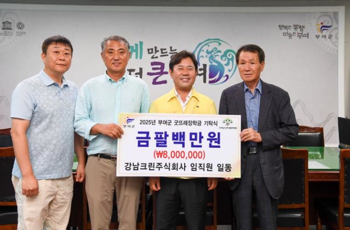 강남크린주식회사 임직원은 지난 22일 부여군청을 방문해 인재 육성을 위한 장학금 8백만 원을 (재)부여군굿뜨래장학회에 기탁했다.