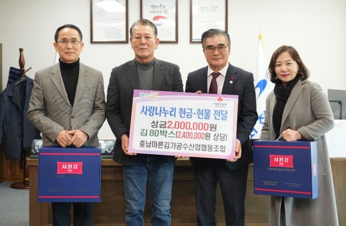 충남마른김가공수산업협동조합은 지난 18일 서천군청을 방문해 사랑나누리 성금 200만원과 240만원 상당의 김 80박스를 기탁하며 지역사회에 따뜻한 온정을 나눴다.