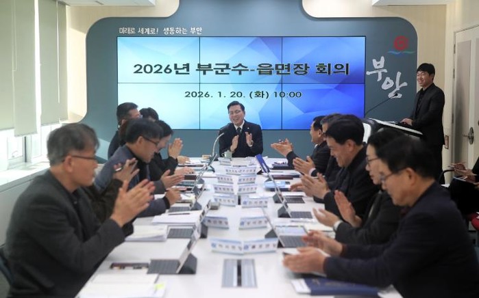 부안군은 20일 군청 3층 중회의실에서 정화영 부군수 주재로 2026년 부군수-읍·면장 회의를 개최하고 2025년 주요 성과와 2026년 군정 운영방향을 공유하며 읍·면 현안에 대한 사전 점검에 나섰다고 밝혔다.