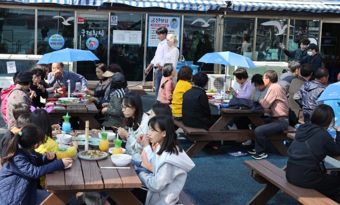 ▲ 강진마량놀토수산시장을 찾은 관광객들의 모습이다. |