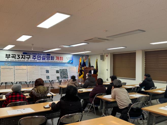 김천시는 2026년 지적재조사사업 실시계획에 따른 사업지구 지정을 위하여 1월 13일 평화동 보훈회관에서 부곡3지구 토지소유자 및 이해관계인 등을 대상으로 주민설명회를 개최했다.