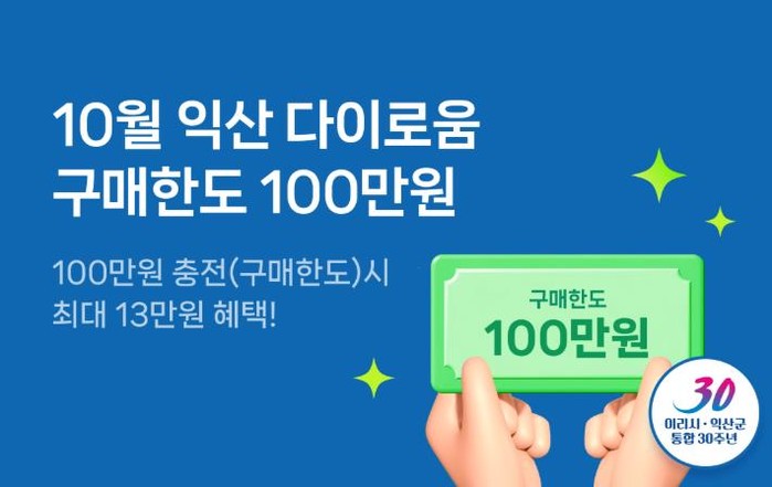 익산시가 이리시·익산군 통합 30주년과 시민의 날(10월 3일)을 기념해, 10월 한 달간 지역사랑상품권 '익산 다이로움'의 개인별 구매한도를 기존 60만 원에서 100만 원으로 확대한다고 30일 밝혔다.