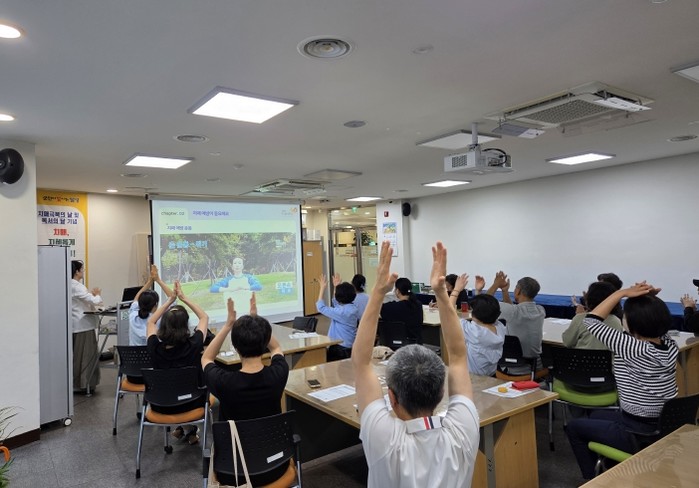 ▲ 달성군보건소 치매안심센터, 도서관에서 펼치는 치매극복 캠페인 사진 5(달성군보건소 치매안심센터의 치매극복 캠페인 참가자들이 치매예방 체조를 하는 모습) |