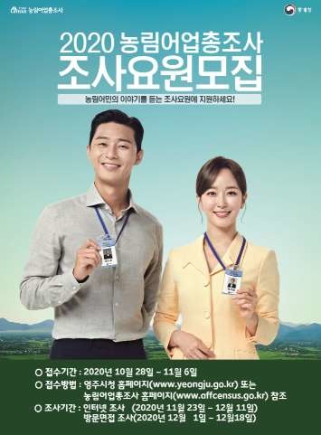 경북 영주시(시장 장욱현)는 오는 28일부터 11월 6일까지 '2020 농림어업총조사'의 조사요원을 총 115명을 모집한다.