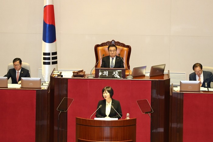 ▲1일 오전 국회 본회의장에서 이정미 정의당 대표가 대표 연설을 하고 있는 모습. <사진=곽정일 기자> |