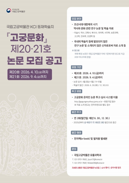 국가유산청 국립고궁박물관은 조선시대와 대한제국기의 역사·문화 연구를 활성화하기 위해 박물관에서 매년 발간하는 학술지 『고궁문화』 제20호와 제21호에 수록할 논문을 모집한다. 제20호는 올해 6월 30일, 제21호는 12월 30일 발간 예정이며, 논문 접수 마감일은 각각 4월 10일과 9월 4일이다.