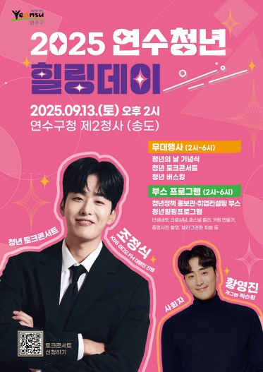올해 토크콘서트에는 SBS 아나운서 출신 방송인 조정식이 참여해 꿈을 이루기 위한 노력과 경험을 주제로 연수구 청년들에게 들려주고 싶은 이야기와 청년 고민 상담 등 진솔한 이야기를 나눌 예정이다.