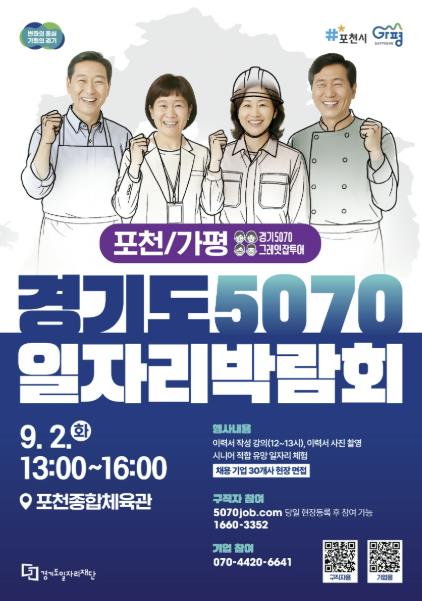 포천시는 오는 9월 2일 포천종합체육관에서 50~70대 중장년층의 재취업을 지원하기 위한 ‘2025 경기도 5070 일자리박람회 in 포천+가평’이 열린다고 밝혔다.