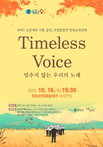청송군은 오는 16일 저녁 7시 30분, 청송문화예술회관 대공연장에서 APEC 성공개최를 기원하는 국립합창단 청년교육단원 공연 ‘Timeless Voice – 멈추지 않는 우리의 노래’를 개최한다.