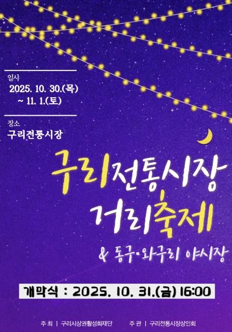 같은 기간 구리 전통시장(포차 거리)과 구리역 골목형 상점가에서는 ‘동구·와구리 야시장’이 운영된다. 이곳에서는 거리공연, 미니게임, 문화 공연과 함께 온누리상품권 환급 이벤트 등 다양한 즐길 거리와 혜택이 마련되어, 야간 상권의 활력 제고와 지역 소비 촉진을 목표로 한다.