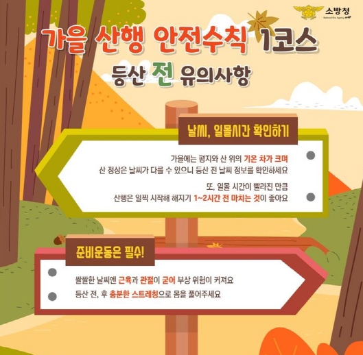 가을철에는 평지와 산 정상의 기온 차가 크고 일몰 시간이 빨라 안전사고 위험이 높아지는 만큼, 산행 전 기상정보와 일몰 시간을 반드시 확인하고, 해지기 1~2시간 전에 하산을 마치는 것이 좋다.
