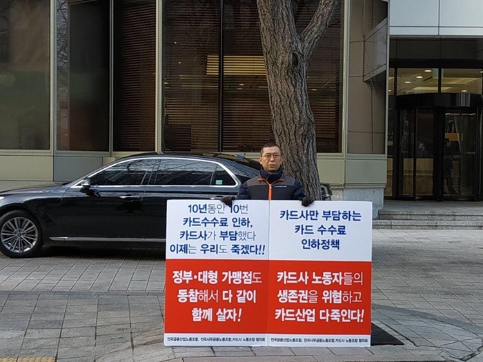 사무금융노조는 "금융위가 발표한 카드수수료 인하안이 실현될 경우 카드사는 약 1조4000억원을 추가로 부담하게 된다"며 "전년도 8개 전업카드사의 전체 순이익이 1조2000억원인 것을 감안하면 국내 신용카드사는 적자를 감수해야 한다"고 주장했다.