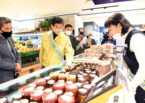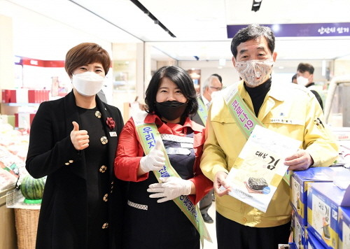 윤화섭 안산시장이 지난 28일 롯데백화점 안산점에서 열린 ‘코로나19 극복! 안산시 농가 살리기’ 농특산물 특별판매 행사장을 방문해 생산농가들을 격려하고 농민들의 애로사항을 청취했다.