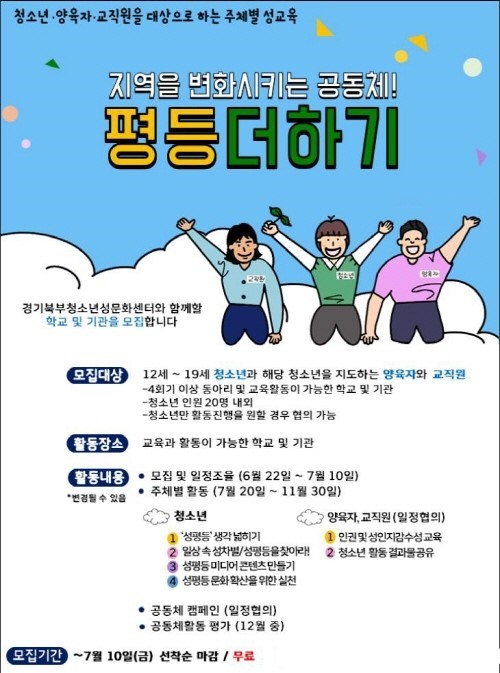 경기북부 청소년성문화센터는 찾아가는 성교육사업의 일환인 ‘평등더하기’ 성교육 동아리 활동에 참여할 학교와 기관을 모집한다고 3일 밝혔다.
