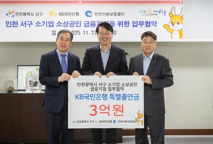 인천 서구는 지난 7일 국민은행, 인천신용보증재단과 함께 45억원 규모의 ‘소기업·소상공인을 위한 금융지원 협약보증’ 업무 협약을 체결했다고 밝혔다.